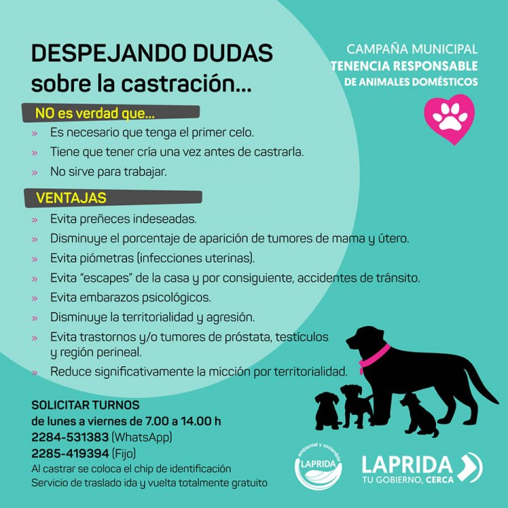 La castración es una cirugía sencilla, rápida, eficaz y gratuita y mantener la reproducción controlada es una decisión saludable, habiéndose realizado en Laprida durante el año 2020 un total de 355 castraciones y desde la implementación del programa en el año 2017 se han efectuado un total de 1379.