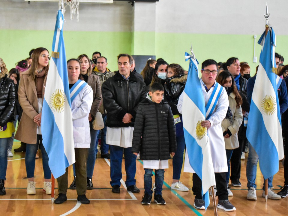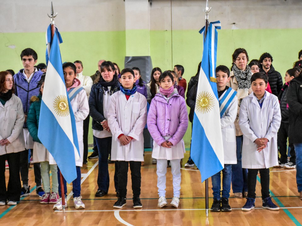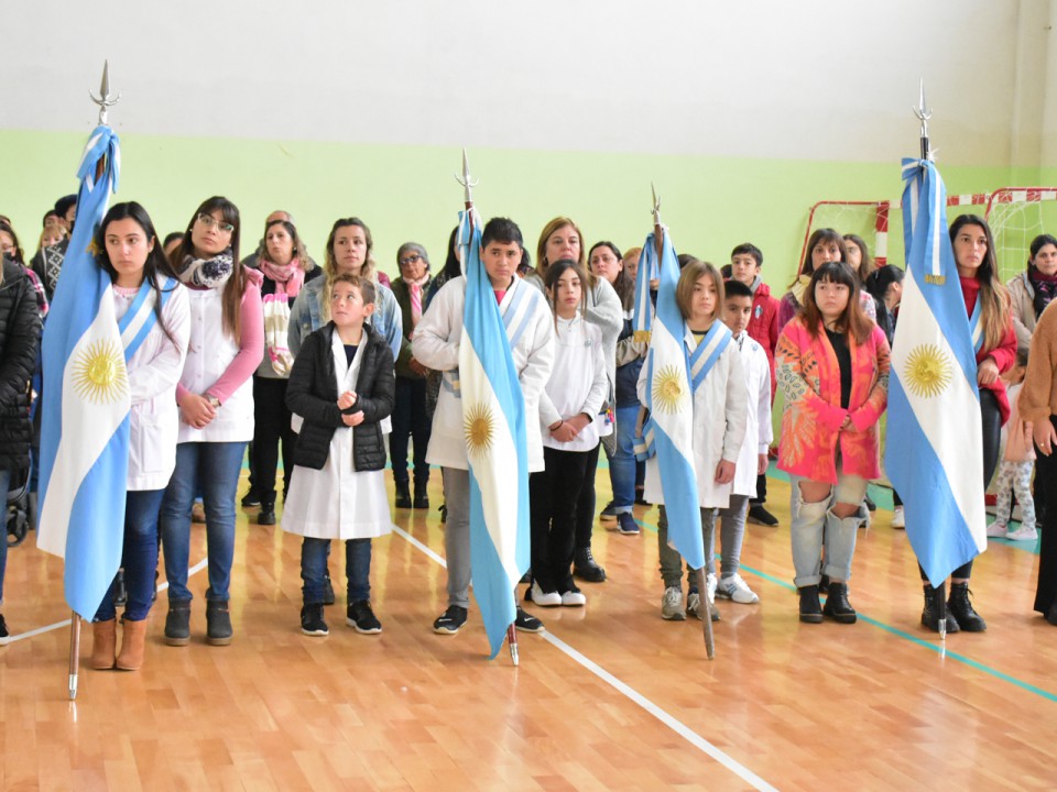 Presidio el acto la Bandera de Ceremonia de la Escuela Primaria N° 1, Manuel Belgrano, portada por su abanderado: Vladimir Figueroa, 1er Escolta, Violeta Paleo; 2do escolta, Paloma Arístegui; 1er escolta suplente, Azul Auzmendi Peláez y la 2do escolta suplente: Genara Couchez Bayala.