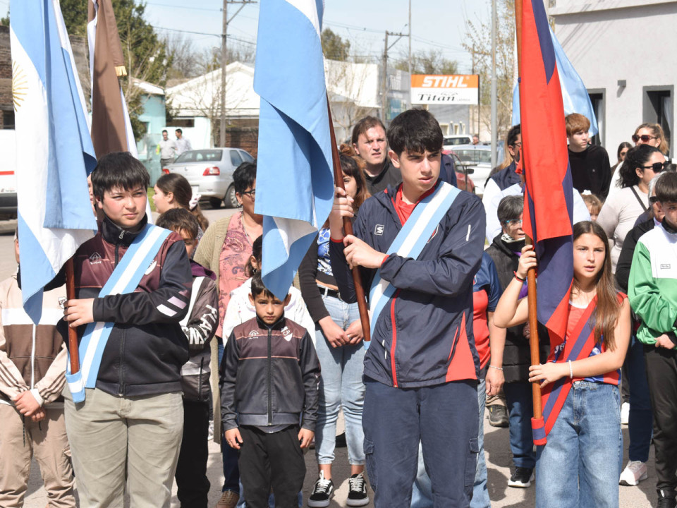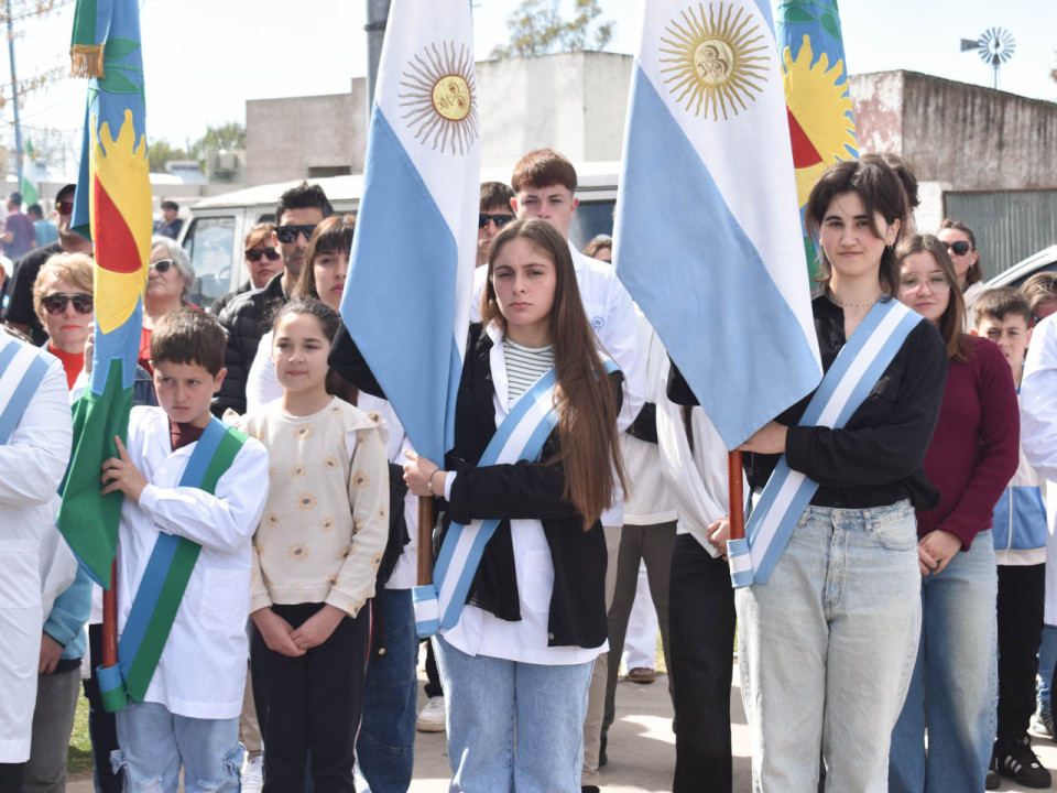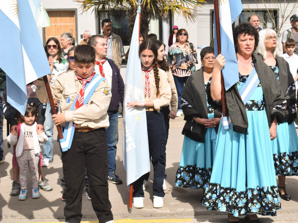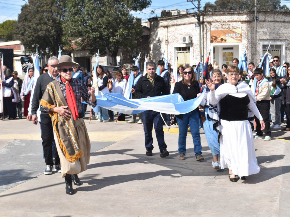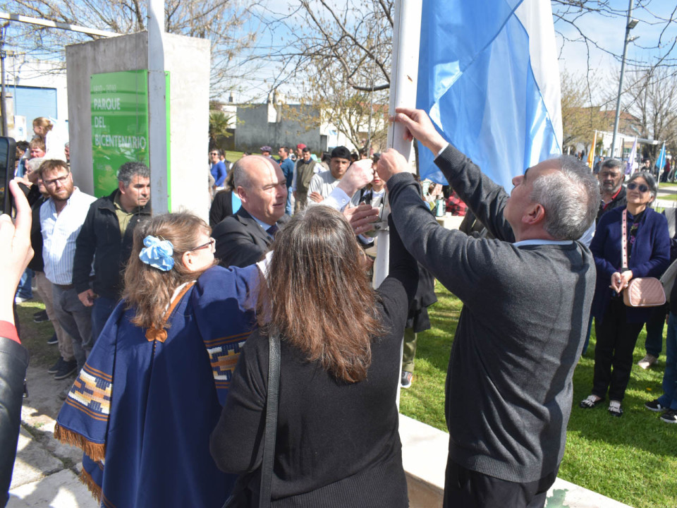 La bandera de ceremonia fue trasladada por integrantes de las siguientes instituciones en un año muy especial para ellas: Centro Recreativo y Empleados de Comercio, Biblioteca Popular Laprida y Malón Danzas. El Intendente Fisher junto a integrantes de estas instituciones izaron la bandera nacional en el mástil del Parque.