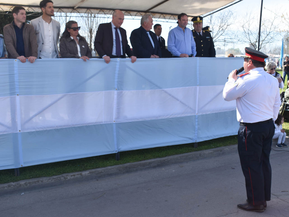 Desde el palco, el Intendente Municipal, Alfredo Rubén Fisher, otorgó al Jefe del Cuartel de Bomberos Voluntarios, Cristian Mendía, el permiso para dar inicio al desfile.