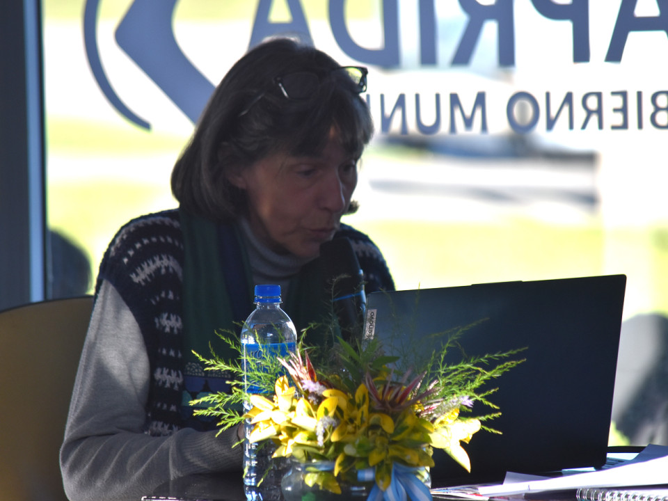 La arquitecta Marta García Falcón, presidenta de la Comisión de Patrimonio de la Sociedad Central de Arquitectos, y presidenta del Centro Cultural Salamone de Balcarce, fue la encargada de brindar la primera charla sobre la obra de Salamone en la Municipalidad de Alberti.