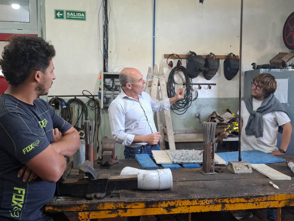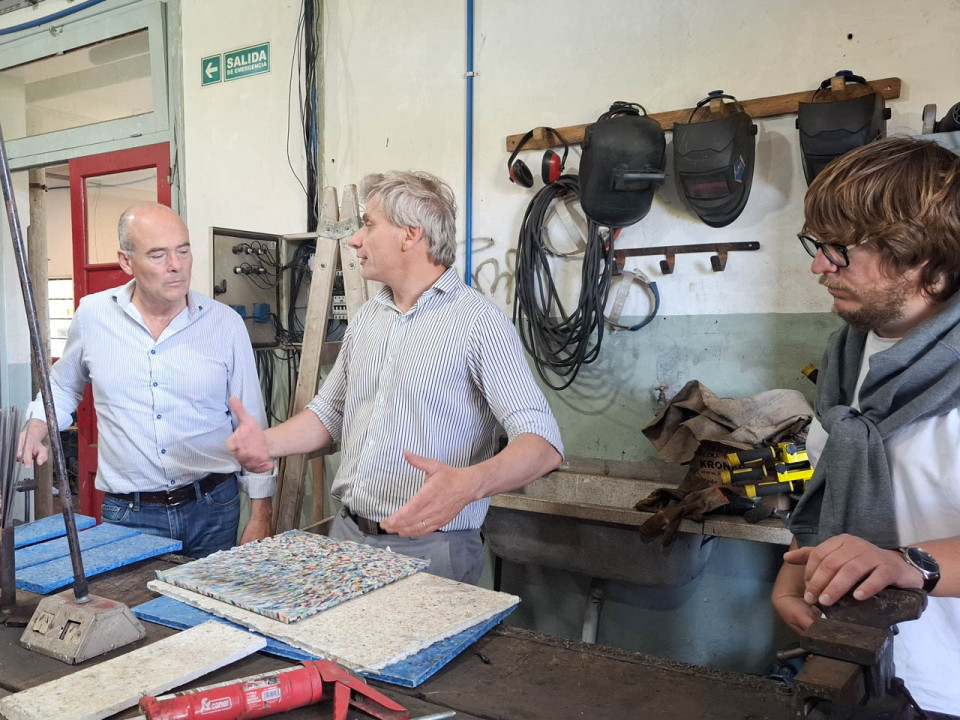 El Intendente Alfredo Rubén Fisher, visitó el viernes pasado, las instalaciones de la Escuela Secundaria Técnica Nº 1, que funcionan en la Escuela Nº 5, y allí mantuvo un encuentro con el Director del establecimiento educativo, Walter Caligiuri y alumnos que concurren a él, y recorrió la línea de producción de procesamiento de plástico para la elaboración de distintos elementos con este material recuperado que lleva adelante la escuela.