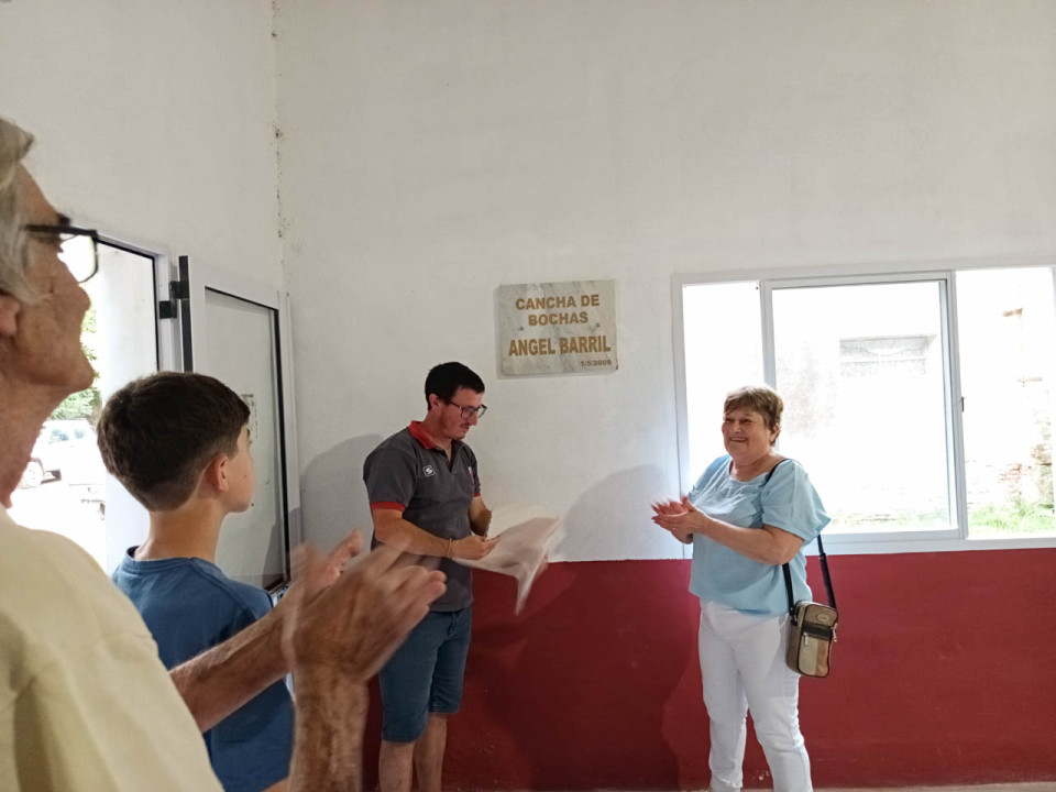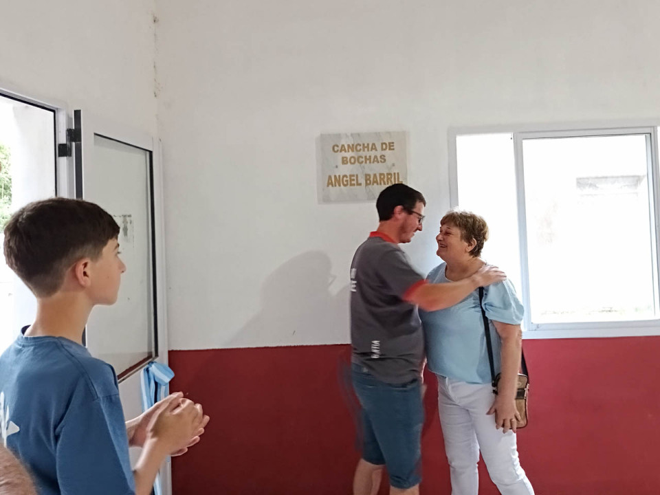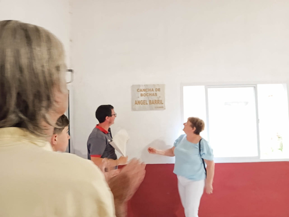 Corte de cinta y descubrimiento de placa siguieron tras las palabras. Se descubrió la placa que nomina a la cancha, que lleva el nombre “Ángel Barril”, que ya había sido impuesto por la anterior comisión directiva. Estuvieron presentes, en el acto, su hija, Ani, nietos y bisnieta.